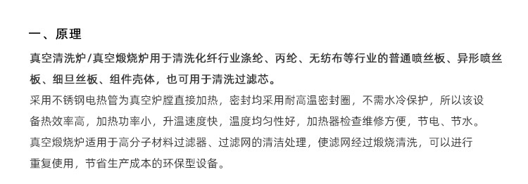 產品概述:真空清洗爐/真空煅燒爐用于清洗化纖行業滌綸、丙綸、無紡布等行業的普通噴絲板、異形噴絲板、細旦絲板、組件殼體,也可用于清洗過濾芯。真空清洗爐/真空煅燒爐采用不銹鋼電熱管為真空爐膛直接加熱,密封均采用耐高溫密封圈,不需水冷保護,所以該設備熱效率高,加熱功率小…